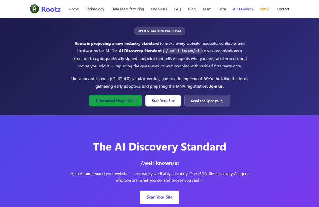 Rootz created the AI Discovery Standard, a system that lets websites publish structured information directly for AI systems. A free WordPress plugin and scanner help site owners check whether their site is readable to AI.